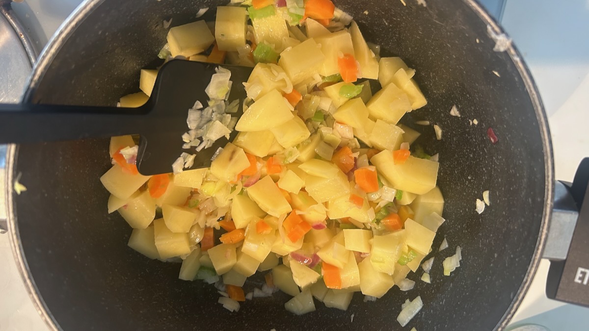 Io ci metto anche un po’ di sedano - Unisci le patate a dadini, mescola e fai insaporire per 5 minuti.