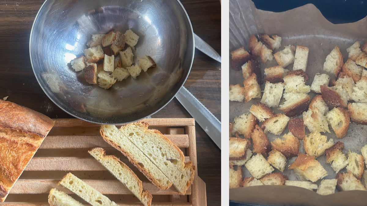 Note: Accompagna con crostini di pane. Taglia il pane a fette, tagliano a striscioline e poi spezzettalo in una ciotola, aggiungi olio, sale e spezie a piacere, poi cuoci in friggitrice ad aria a 180°C per 5-7 minuti o sulla piastra del fornello fino a doratura.