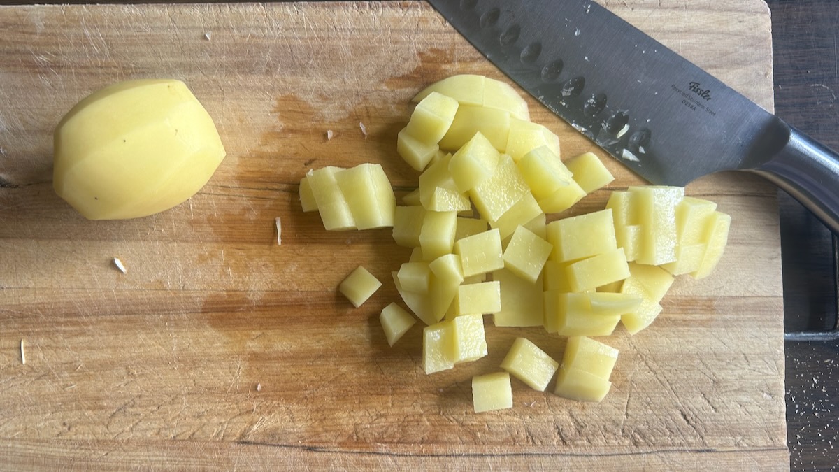 - Sbuccia le patate e tagliale a dadini di circa 1-2 cm.