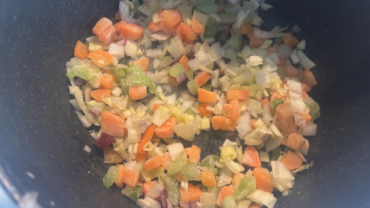 - Aggiungi il porro tritato e la carota a dadini. Fai soffriggere a fuoco medio per 3-4 minuti mescolando di tanto in tanto.